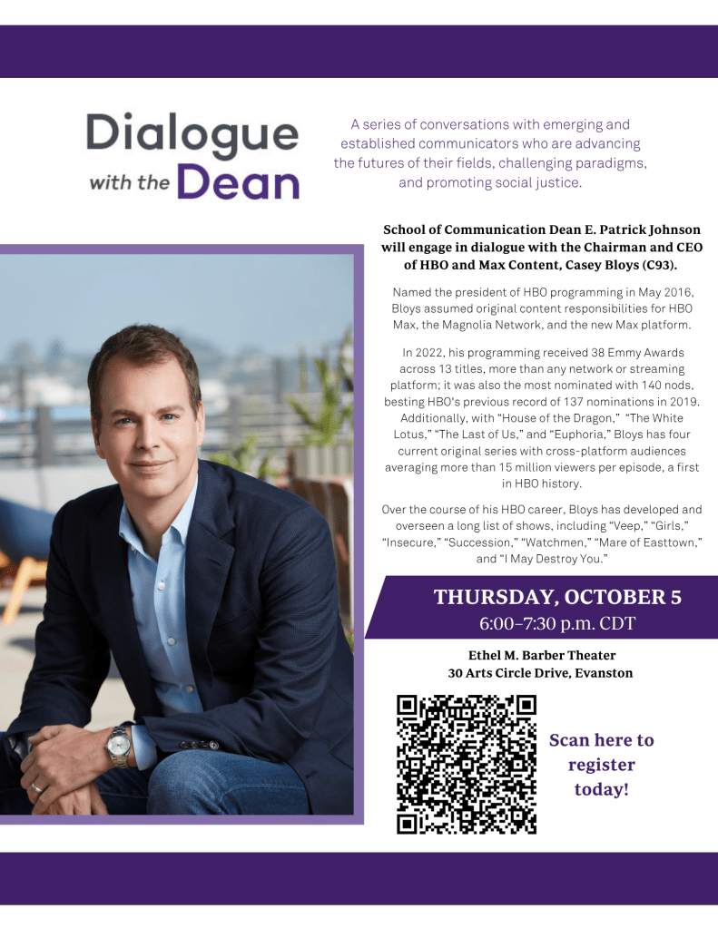 Flyer created to promote the Dean’s conversation with Chairman and CEO of HBO and Max Content, Casey Bloys.